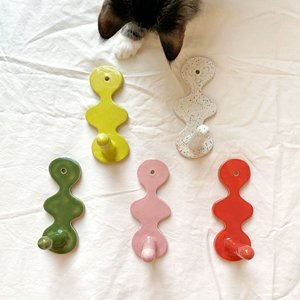 Hand built ceramic wall hooks in various swoops, wiggles, blops and bubbles. They look fantastic alone or in a large grouping! Please leave a note when purchasing which color drywall screw you would like with your hook: yellow, cobalt blue, or pink Handmade in Brooklyn, NY by Julia Elsas Dimensions: 4.5" x 2" x 3" See Julia's hooks featured in Architectural Digest!