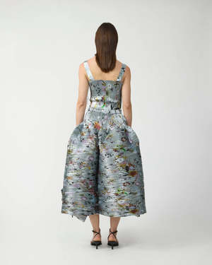 A full-volume midi skirt from Paris-based designer Julia Heuer, handpleated using a shibori technique. Each piece is individually pleated by hand, resulting in distinctive shading and color variation that makes every garment unique. Made from a rare upcycled metallic fabric with an in-house designed print. Features a yoke waistband, hidden pockets, and an elasticated waist with an extraordinary full hem. Composition: 100% Recycled Polyester. Designed in Paris, Made in Estonia. Measurements Sizing: One Size Fits Most. Waist to hem: 90cm / 35.5" Waist: 68120cm / 2747" Hem: 270cm / 106" *Measurements reflect the garment with pleats contracted to fully expanded.