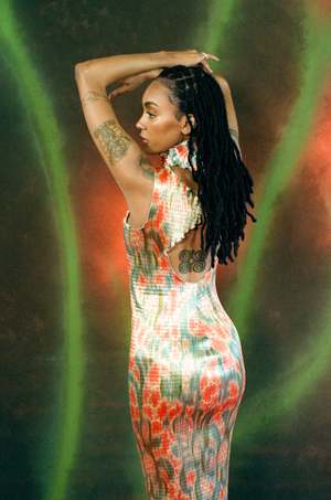 Sleeveless midi dress with a mock neck, slightly separated shoulder cutout, an organically shaped circle cutout in the back, and lettuce hem detailing. It naturally exposes the skin, giving this piece a sensual allure. Fitted with stretch, while maintaining an intentional structure that Julia Heuer's designs are known for. Featured in metallic mossy silver, orange, and light yellow, like the golden hour sun fading into the night sky. This garment has undergone a special process which results in variations of shading and color. These variations are intended and add to its unique characteristics. It is recommended to wash separately until no further color is released. Avoid contact with light-colored garments, furniture, or fabrics. Material: 100% polyester. Hand wash in cold water and lay flat to dry. Do not bleach, tumble dry, iron, or dry clean. Made in Estonia.