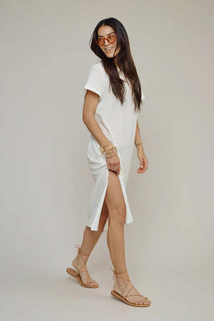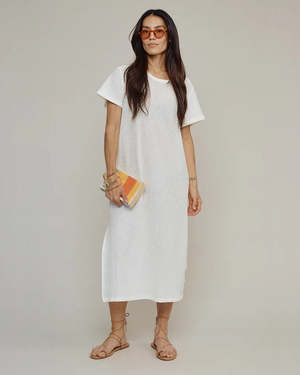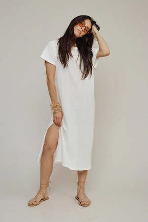 Laid-back yet sophisticated, this easy coverup dress is cut to flatter, drape, and move with you. It has the perfect sleeve, a subtle side slit, and just the right amount of edge and sheerness. Easy, relaxed fit short sleeve crewneck midi dress. Open, gently scooped neckline. Capped sleeve, but not too short. Slit side seam approximately 17.5" on right side. Oversized 1" hem. 29% Hemp / 69% Organic Cotton / 2% Spandex. Machine wash cool, gentle cycle with like colors. Tumble dry low. Do not use spot laundry cleaners, bleach, or other chemical and enzyme cleaners like oxi-clean. Avoid washing with garments with zippers or velcro or with textured towels, as this will cause abrasion and pilling. Made in the USA.
