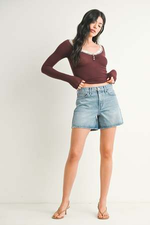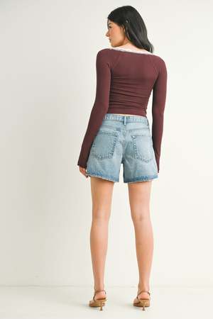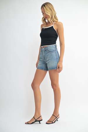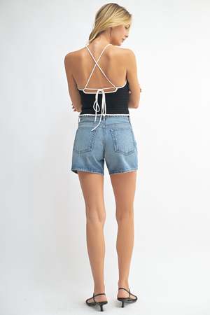 Designed to sit comfortably at the natural waist, these shorts feature a flattering high-rise cut that elongates the legs, making them perfect for pairing with everything. With a clean hem and subtle fading, these shorts offer a lived-in, authentic vintage look that complements any summer wardrobe. Details - Rise 10.5 ; Inseam 5 - 100% Cotton - Made in USA - Style no. BH507N - Model is wearing a size S - Machine wash cold, lay flat to dry recommended.
