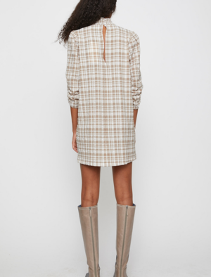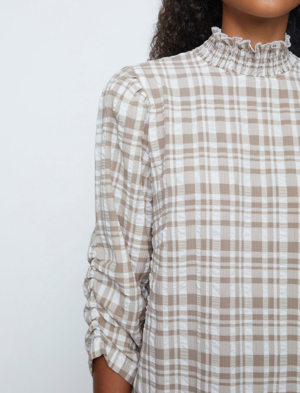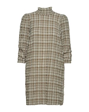There's something about this dress... The fit, the colors; we can't put our finger on it, but we just love it! Made from a recycled polyester blend in large check. The dress has a high ruffled neckline with slit and button closing in the back, a boxy fit, and ruffled sleeves. - Dress made from 60% recycled polyester, 34% polyamide and 6% elasthane - High ruffled neckline - Ruffled sleeves - SUSTAINABLE CHOICE
