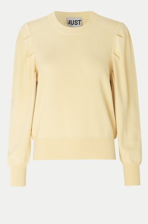 Just Female Amber knit sweater top. This feminine knitted blouse is made from a super-soft viscose and nylon blend fabric. The knitted blouse has a round neck with rib edging and feminine pleats on the shoulders. The sleeves and lower edge of the knitted blouse are completed with a slightly broader rib edging for a sportier look. 65% Viscose, 35% Nylon.