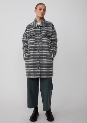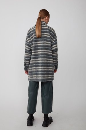 Jacket made from a wool and recycled polyester blend. The striped button op jacket is oversized, has breast- and side pockets and a classic collar. Perfect for the colder days ahead. 50% Wool/50% Recycled polyester