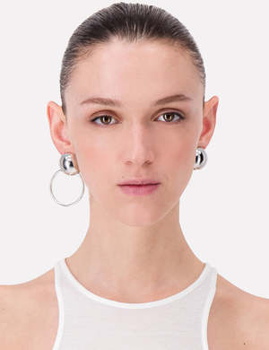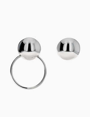 Mismatched domed spherical earrings. One earring features a large ring. Post-back fastening for pierced ears. Details: - By Justine Clenquet - Designed and handmade in France - Care: Avoid contact with liquids (water, perfume, beauty products). Wipe dry with a soft cloth. - Nickel-free - Materials: Brass dipped in palladium - Dimensions: 6 cm, 2.5 cm