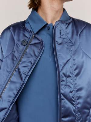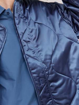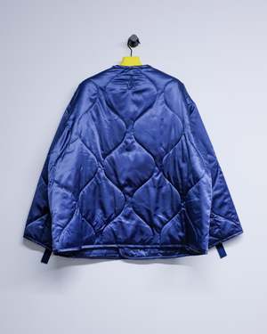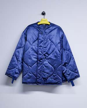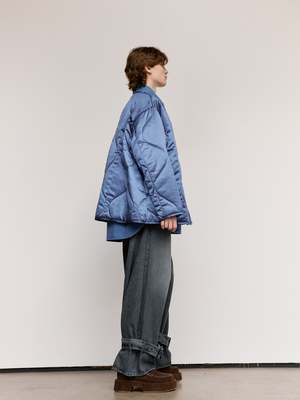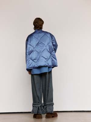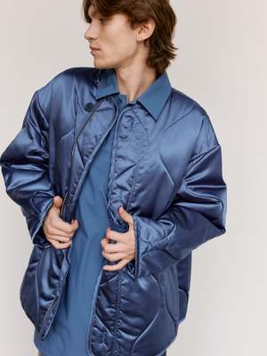 Upgrade your wardrobe with the Light Indigo Oversized Quilted Jacket, as seen on the runway. Designed with a longline silhouette and an oversized fit, this jacket provides both style and comfort. Made from a mid-weight nylon duchesse fabric, it features a button front, dropped shoulders, and a concealed zip closure for a sleek look. Polyamide Model wears a size S.