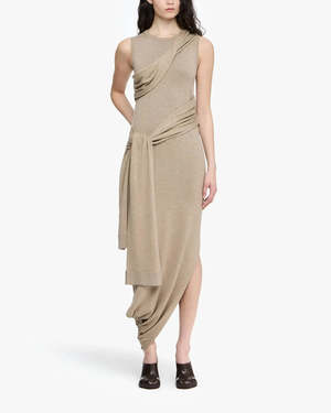 The Tie Detail Sleeveless Dress in Sandstone by JW Anderson is a jersey stitch tie detail wrap dress featuring a draped wrap around tie detail. This easy, refined piece is an artistic addition to a classic silhouette. - Fitted silhouette - Unlined - Composition: 60% Lyocell, 40% Merino Wool - Centre back length: 138cm - Made in: China - SKU: KW1445YN0320140 - Model Height: 178cm, Model Wearing Size: S