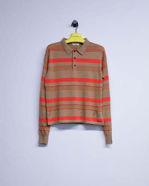 Knitted striped rugby polo top in contrast biscuit matte cotton and high-shine viscose, featuring anchor logo2 embroidery with horn buttons. Cotton Viscose Wool Blend.