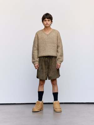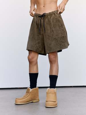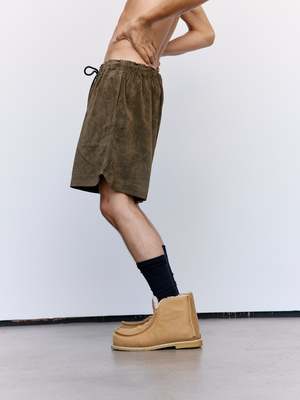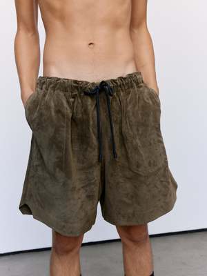 Expertly crafted with a suede finish, these khaki drawstring shorts feature an elasticated waistband for a comfortable fit. The contrasting colored drawcord adds a stylish touch, while side pockets provide convenience. With a regular fit, these shorts are true to size.