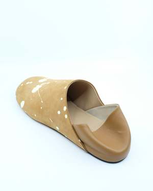 Slipper mules in tan and cream. Crafted in Italy, this mule features an upper in spot printed cow suede with a blind-embossed JW Anderson logo2. Designed with a cushioned insole for comfort, it can be worn with a folded or closed back. Suede & Calfskin.