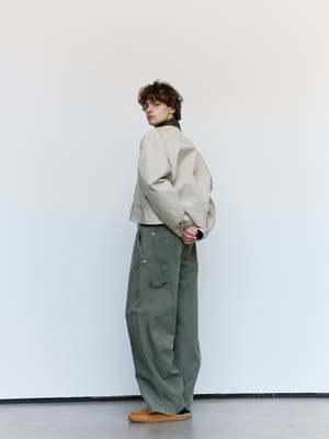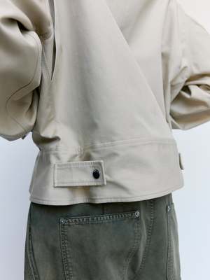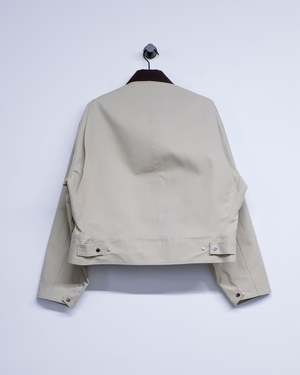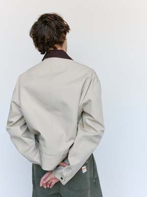 This Nougat & Chocolate Cotton Workwear Jacket features a relaxed fit with dropped shoulders for ease of movement. Designed with a zip closure and snap cuffs, it offers practical functionality alongside style. The curved hem and contrast bonding add subtle design details, while the under collar reveals the fabrics reverse side for a refined touch. Multiple pocketsincluding a zipped chest pocket, side pockets, and an internal snap-closure pocketprovide secure storage. Unlined for lightweight comfort. Cotton Model is 6' and wears a size M.