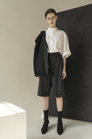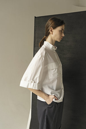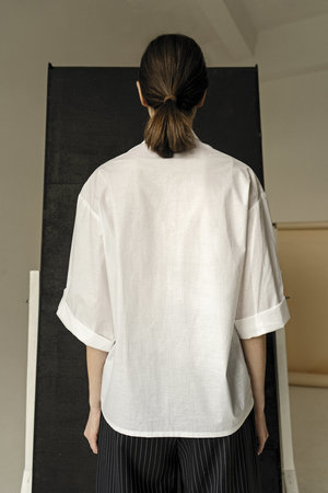 An essential wardrobe staple reimagined, the White Japanese Collar Shirt is a classic unisex tailored shirt crafted from versatile crispy cotton. Regular fitting, this iconic style is finished with button-up cuffs and feature two patch pockets at front. Can be worn alone or layered under a tailored vest to create an effortless look. Gender: unisex Composition: 100% cotton Buttons: 100% natural shells Model is 180 cm tall and wears M size Runs true to size Note that the sizes are given for female outfits For masculine outfits consider that female S size corresponds to masculine XS size Female M size to masculine S Female L size to masculine M Machine delicate clean or dry clean Warm iron inside out. Do not tumble dry. Do not bleach. Handmade in Ukraine by women artisans for women The collectsion is a collaboration between the design studio KM by Lange and Adrienne Moenkediek. The collaboration explores binary conventions through pieces that focus on moldable silhouettes, rooted in the theory that individual style is not driven by a pronoun that we use to identify our - selves. Thereby the concept reforms the stringent separation of genders through the narrative of a couple who can be seen exchanging their clothes.