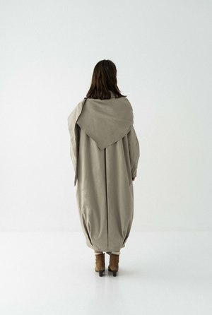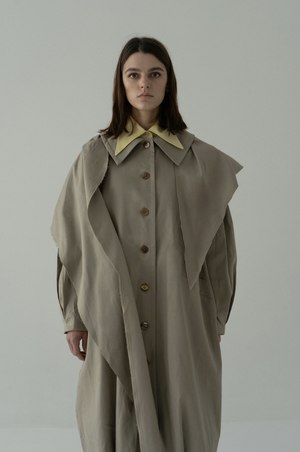 The Mavka Oversize Cocoon Scarf Coat by K M by L A N G E is a long, oversized coat crafted from natural Italian cotton. It features a detachable scarf panel that extends asymmetrically from the shoulders, allowing for versatile stylingworn draped, knotted, or removed entirely for a minimalist look. The scarf drapes fluidly across the front or back, creating a dynamic, layered shape that transforms with movement. When detached, the coat reveals a clean, cocoon-like silhouette. Lined with 100% viscose and finished with nacar buttons. Model is 178 cm tall and wears size S.