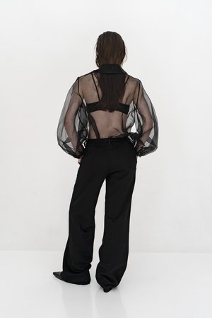 These black tailored pants are cut from a luxurious cashmere-blend fabric that drapes with effortless sophistication. The silhouette is clean and elongated: a mid-rise waist, a straight leg that subtly widens toward the hem, and an ultra-fluid fall that grazes the floor. The construction is minimal yet precise featuring a structured waistband, discreet belt loops, side pockets, and a sharp front crease that enhances the elongated line. The fabric has a dense, matte surface with the soft handfeel characteristic of fine cashmere, giving the trousers an elevated, almost sculptural presence. Designed to pair seamlessly with sheer organza pieces or the signature KM structured jackets, these pants balance tailoring with relaxed elegance. They create a quiet, powerful look: modern, elongated, and deeply refined. Composition: Main fabric: 100% Italian cashmere Dry Cleaning Warm iron inside out. Do not tumble dry. Do not bleach. Handmade by women for women. The model is 168 cm tall and wears S size. SIZES: SIZE S (European 36) bust: fits bust around 85 cm Waist: fits waist around 68 cm Hips: fits hips around 92 cm SIZE M (European 38) bust: fits bust around 90 cm Waist: fits waist around 71 cm Hips: fits hips around 96-100 cm.
