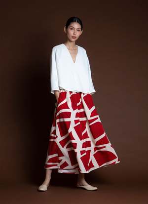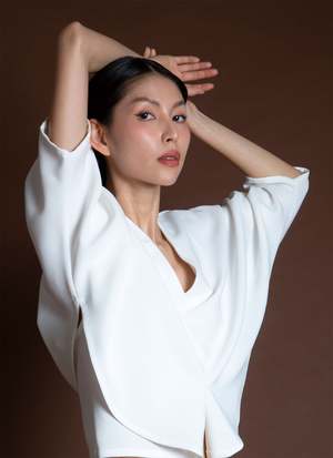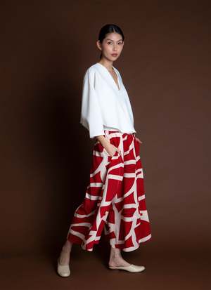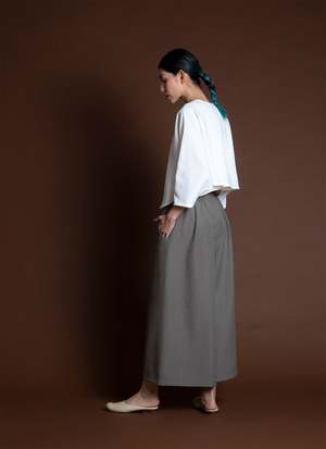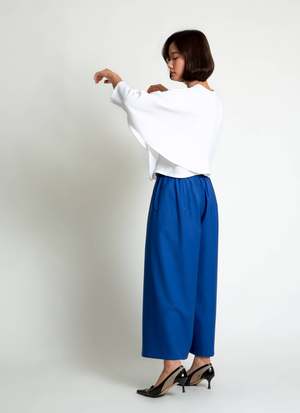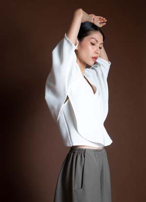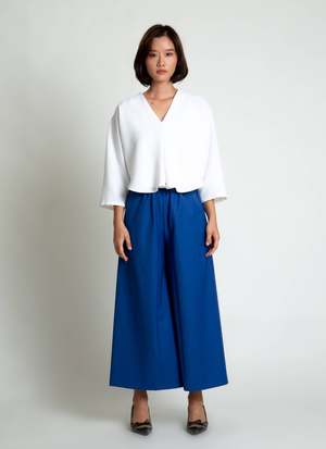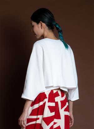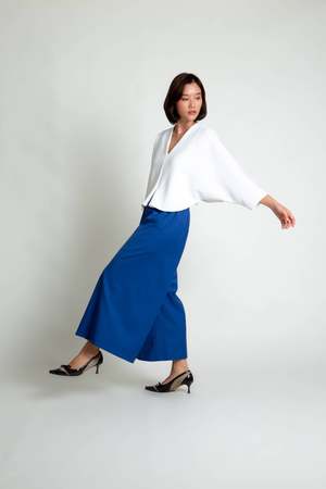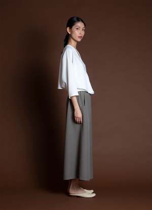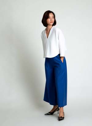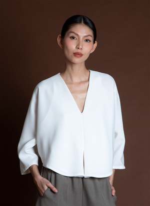 Introducing Sa, the Lemongrass top. It is double folded construction to create this dolam drape at the arm/sides, creating a beautiful layered movement. Features a v-neck, mid-length sleeve, split middle, and slightly cropped with a boxy body. Your new favorite top to go with your favorite Kaarem classic pants! Available for pre-order. Ships mid to end of October.