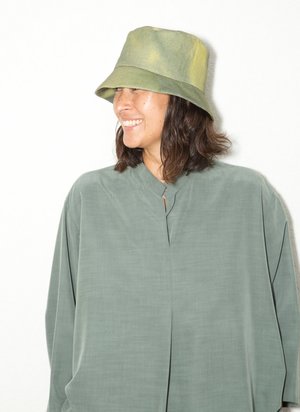 Our unisex lightweight linen bucket hat with a Kaarem original print. Perfect for everyday wear. The handsewn bucket hat is foldable and washable. Clean finishing allows the hat to be worn reversible. Naturally hand-dyed in our studio using our remnant fabrics. The print we designed is inspired by gelatin created by the red algae. The algae is collectsed in the oceans near central Vietnam and used in making a type of Ch, a Vietnamese dessert. Algae is a vital presence in our oceans for both producing oxygen and as a source of food for marine life. The hat shape is inspired by the mushrooms sprouting in our gardens at the studio and at Que. This is the ADULT size.