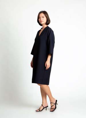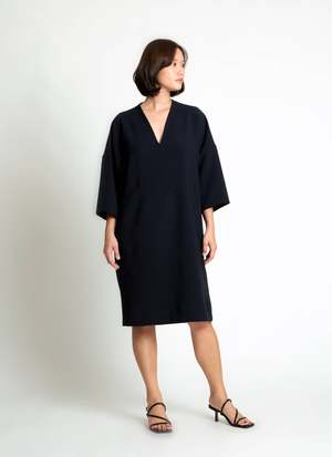 The Alluvial 3/4 Sleeve V Neck Pocket Dress features a V-neck with a center seamline that leads to a side seam pocket. The dress has mid-length sleeves, a dropped shoulder, and a relaxed boxy fit that tapers at the bottom. Its knee length gives the option of wearing it as a dress or as a tunic layered over pants. Dry cleaning is recommended to preserve the hand-finished blind hem stitch. If machine washing, use cold delicate and low heat to dry. Avoid items with hooks or clasps to prevent snags. Details - Relaxed fit; true to size - 100% crepe polyester - Model is 56 wearing size small.