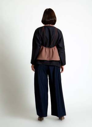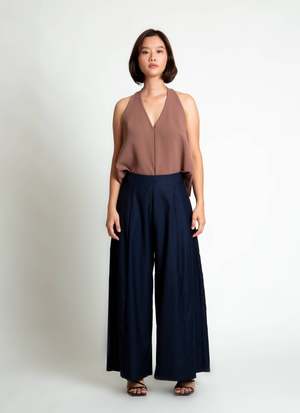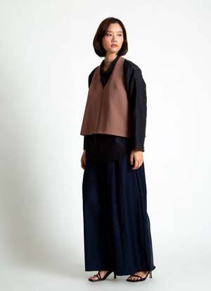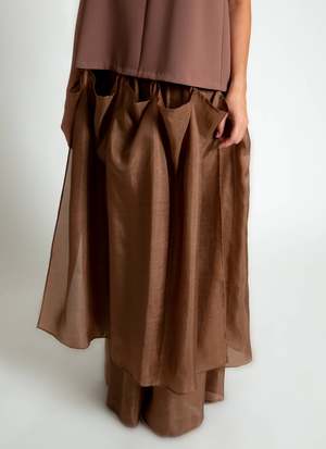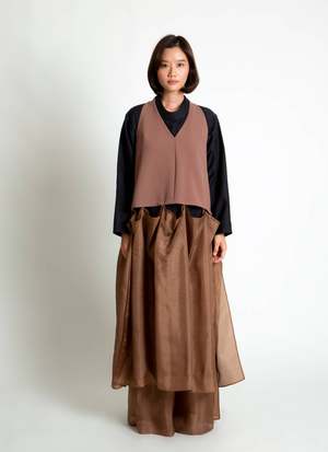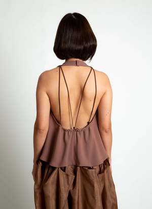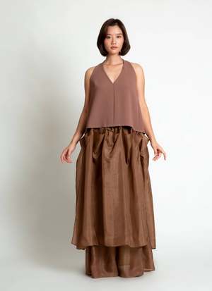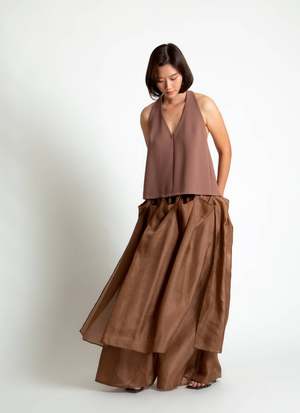 The Rhythm Halter o Di is a v-neck dress inspired by the Vietnamese o Ym, a classic halter-style garment worn as an underlayer or standalone piece. This handcrafted two-panel design flows into a versatile panel skirt (100% silk organza) attached with buttons and ties, allowing the panels to be removed (to wear as a top) or secured (to wear as a dress) as desired. The pleated (or straight) skirt panels with side slits create a graceful sense of movement, enhancing the designs rhythmic flow. The fabric is carefully chosen to balance structure and lightness, ensuring both comfort and style. Effortlessly versatile, the Rhythm Halter o Di can be styled over dresses or pants for a layered, dynamic look. Nhp, meaning "rhythm" in Vietnamese, symbolizes the balance, flow, and harmony embodied in this piece. Color: Cacao Brown / Brown Silk Organza Details & Care The Blind Hem Stitch is Kaarems commitment to and celebration of cultural preservation. The craft of making an o di, the traditional Vietnamese garment that inspires the collectsions, focuses on the use of the Blind Hem Stitch where no seams are visible on the exterior. Kaarem is influenced by these age-old Vietnamese sewing techniques, and we seek to update them for our clothing designs. In each Kaarem piece, you will find the handcrafted care from our production studio team in Saigon. Fit Relaxed fit. Materials Top: 100% Crepe Polyester Bottom: 100% Silk Organza Model Model is 5'5", wearing size small.