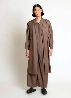 This unisex sleeveless long vest combines simplicity with understated functionality. Featuring a collarless neckline, it presents a sleek yet casual silhouette. Designed to balance structure and comfort for everyday use, it includes carefully crafted details such as a handbraided loop with button closure, a single button, and convenient pockets. Handcrafted with attention to detail, this piece embodies refined craftsmanship. Available for pre-order. Ships in 810 weeks. Color: Brown Care Machine washable. Avoid adding any garments with hooks or clasps in the wash as these garments are hand-finished with a blind hem stitch. Fit True to size. Fits relaxed. Material 57% Polyester, 43% Wool Model Model is 5'6", wearing size Small.