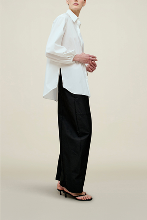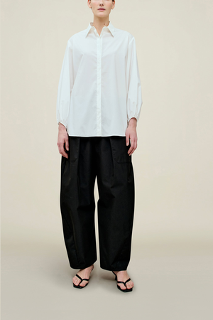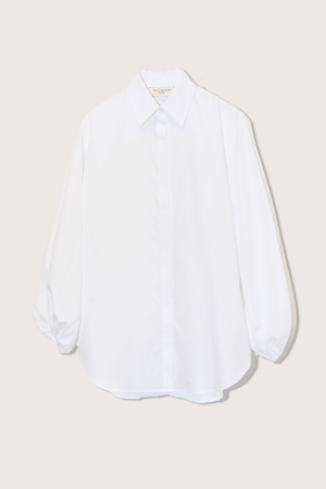 Oversized button-down cotton poplin shirt with dramatic balloon sleeves. Classic pointed collar. Clean, concealed placket. Relaxed silhouette perfect for modern layering. 70% Cotton / 30% Polyester Roomy fit, true to size. Model is 5'11" and wears size small. Proudly Made in New York.