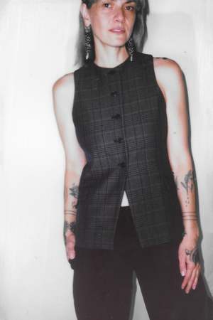 By Kallmeyer Best selling sporty and tailored sleeveless racer style suit vest. Five buttons down center front, crew neck, cutaway just below waist for flattering styling. Features slanted flap pockets and small vent at back. Fully lined. Proudly made in New York. Slim, tailored fit with no stretch. If between sizes or for larger busts, recommend sizing up. color: smoke winter madras