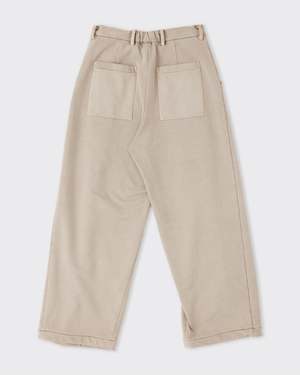 Sweatpants reimagined through Kanemasa's 36-gauge knitting the fabric is dense, smooth, and drapes more like a trouser than a jogger. Pigment-dyed in a washed beige khaki that feels effortlessly broken in, this piece blurs the line between comfort and intention. Made in Japan. Details - 36-gauge ultra-fine knit construction - Pigment-dyed for a naturally faded finish - Elasticated waistband - Relaxed tapered leg Fabric 78% Recycled Organic Cotton, 19% Nylon, 3% Polyurethane Sizing (cm) S, M - Waist: 72 (S), 76 (M) - Rise: 28 (S), 29 (M) - Inseam: 68 (S), 71 (M)