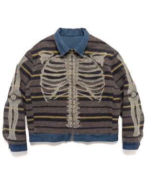 A jacket inspired by vintage workwear featuring a cropped fit with a zip front and three front pockets. This fully reversible design includes an inner blanket detail and, when reversed, displays a large bone pattern across the entire surface. Finished with a contrasting collar, zip pockets, and a straight hem. Made in Japan. Outer: 60% Cotton, 40% Nylon Lining: Fleece 65% Acrylic, 35% Polyester Machine wash cold.