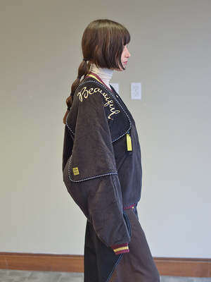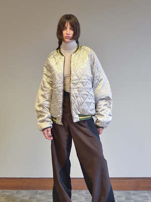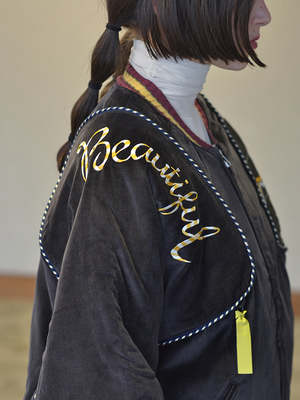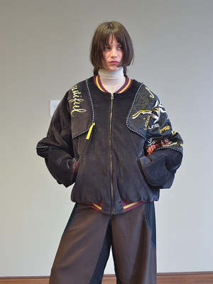 Continuing with Kapital's series of bomber jackets with elaborate embroideries celebrating various cultural highlights of certain countries, in this case, Nepal. All the classic elements of a bomber, with innovations like velveteen, colorful needlework, collegiate striped ribbed cuffing. It's also reversible, with the other side a shiny quilted silver and a whole new color story on the contrast rib. And in another also, there are zips that allow one to fold it all up in to a little square, zipping it shut into a little velvet pillow. Yet another clever little twist. Unisex. Iona is a US 2 and wears the JP3/Medium.