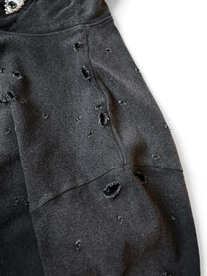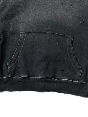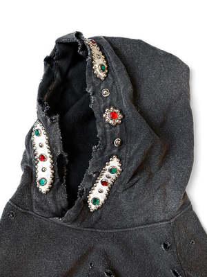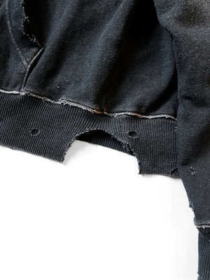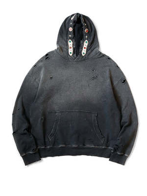This hooded sweatshirt features vintage-inspired studs adorning the hood. Crafted from dry-washed fleece, it presents a distressed and weathered aesthetic for a timeless, worn-in appeal. 100% Cotton Made in Japan