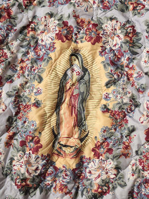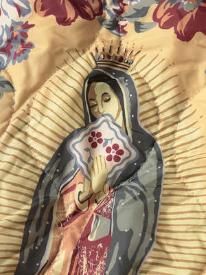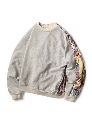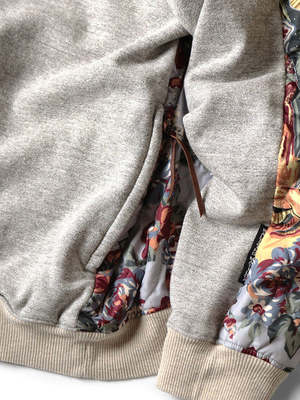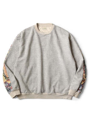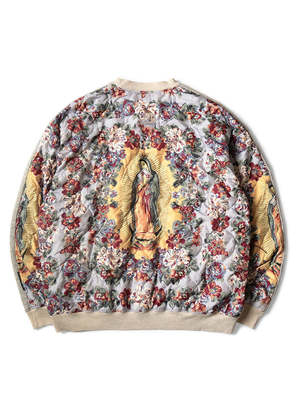 This sweatshirt features a striking quilted back panel showcasing an image of Maria cradling a cookie. Designed in an oversized fit, it offers a relaxed silhouette for ultimate comfort. The front is crafted from premium TOP fleece, combining softness with refined style. Made in Japan.