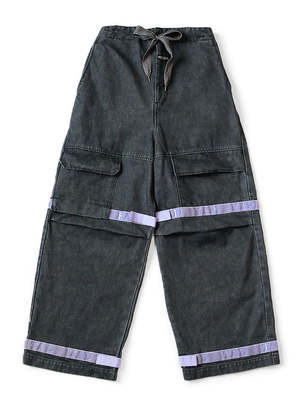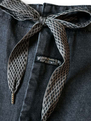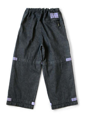 Pants with a voluminous wide silhouette. Made from 14oz denim with black warp and weft. The waist has an easy design with elastic and string. Hook-and-loop fasteners with the word KAPITAL are attached to the knees and hem, allowing you to adjust the silhouette to your liking. 100% cotton Tape part 100% nylon Tape part 100% polypropylene Waist string 95% cotton 5% polyester