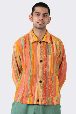 Scrap textiles from assorted garment production factories have been shredded, re-spun into yarns and woven on a handloom to produce this multi colored check pattern fabric. * 100% Handloom Cotton Recycled Waste * 4 Button Medium Weight jacket * Corozo buttons * Regular Collar * Boxy fit * Made by one tailor from beginning to end * Hand-finished