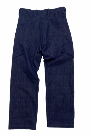 A modern day cargo pant meets tailored denim. hand loomed denim with diagonal bucket pockets, waist belt cinch detail. runs big so size down. 100% cotton