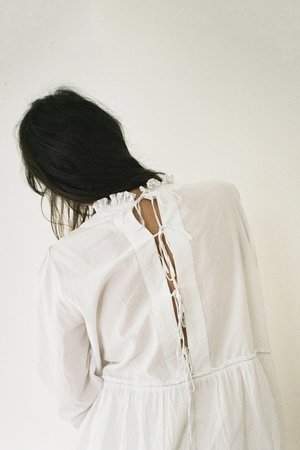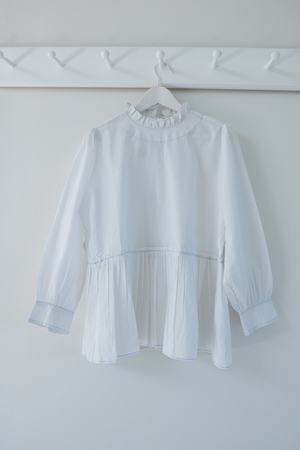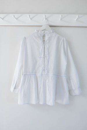 White cotton voile blouse with pale blue contrast hand stitching. Features a small ruff at the neck, wide micro-pleated ruffle at the waist, and fastens with ties at the back. Due to the handmade nature of these shirts, each special piece is subtly unique. Pre-Order: Delivers first week of July.
