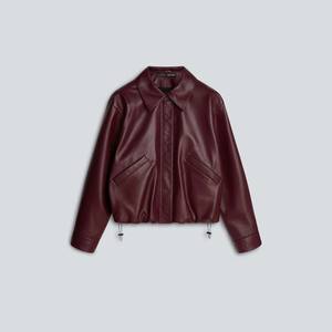 The Bomber Short in bordeaux is crafted from smooth lamb leather, balancing durability with a refined look. It features a snap-button front placket and an adjustable drawstring hem with cord stopper, allowing the waistband to be customized for comfort. Designed with dropped shoulders and a relaxed fit, this versatile bomber combines effortless style with everyday wearability. Composition: 100% lamb leather Developed in Germany and produced in Poland.