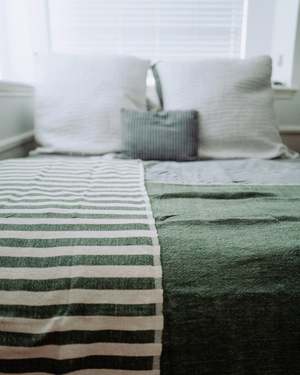 This large towel is made from 100% organic cotton in olive. It has been spun, dyed (AZO free), woven, and sewn by artisan partners. The towel measures 28" x 56" and features a thin natural border along the vertical edge.