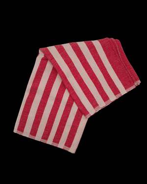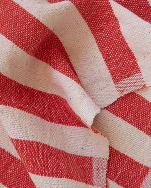 This large towel is crafted from 100% organic cotton and features a red stripe design with a wide 1-inch horizontal natural stripe. Spun, dyed (AZO free), woven, and sewn by artisan partners. Measures 28" x 56". Multifunctional use.