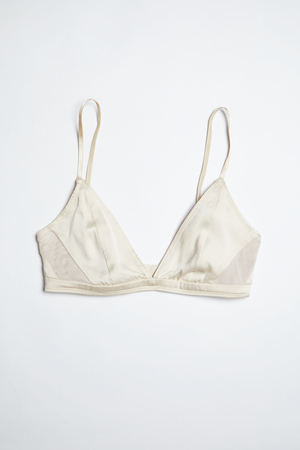 Kent Zap organic silk soft bra. Triangle bra in lustrous white organic silk with mesh detailing at sides and black straps. Soft yet highly supportive. Triple-lined empire band and double-lined cups offer significant support. Defined seams and adjustable straps. Organic silk warp net detailing at side. Double hook and eye back closure. 95% certified organic silk, 5% elastane. Hand wash for longer life, and lay flat dry. Made in Los Angeles.