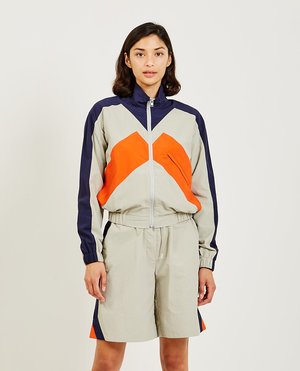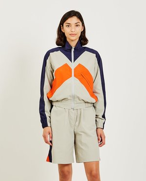 Sport paneled windbreaker jacket by KENZO. This pale grey/orange/blue classic collar jacket is embellished with K-shaped panels and features a small logo2 to the back. Other highlights include a front zip-fastening pocket, elasticated cuffs, elasticated hem, and mesh lining. Store ID: FB52BL1299CO Model is wearing size: S Model is: 5'10", Bust 33", Waist 24.5", Hips 33.5" Outer: Polyamide 100% Lining: Polyester 100% Dry Clean Only Imported