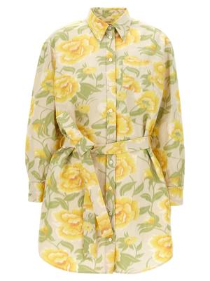 Peonies Kimono sleeve dress in printed cotton blend canvas. Shirt model with belt knotted at the waist, front pocket, wide sleeves with cufflinks. Composition: 36% Polyester, 36% Linen, 28% Cotton.