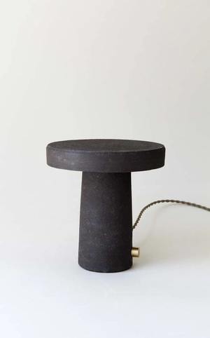 Sculptural and grounding, this handbuilt lamp is crafted from raw black sculpture clay with a matte textured finish and a minimalist silhouette. The light emits a soft, ambient glow, ideal as accent lighting. - Unfinished brass dimmer knob - Cord: 8 ft antique cloth-covered lamp wire - Two-prong phenolic plug Note: All individual electrical parts are UL listed, USA. Lead time: 612 weeks.