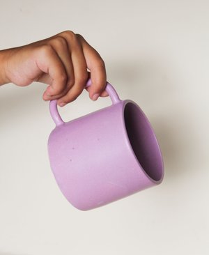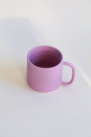 Stoneware mug with interior and exterior coated with a soft matte lilac glaze Approx. 3.5"H x 5"W Dishwasher safe Please note: This item is handmade and each piece is unique, some variations are to be expected Made to order 2-4 weeks, varies