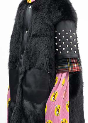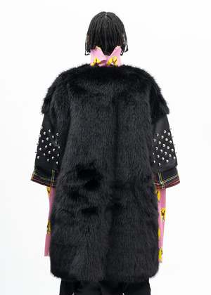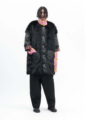 Faux-fur studded 3/4 length sleeve coat in black from KIDILL. Features an oversized panelled layered construction with a faux fur shell, studded leather sleeves, and plaid print cuffs. Silver-tone press-stud fastening along the front face. Tonal stitching and lining throughout. Shell 1: 100% Polyester Shell 2: Cow Leather Shell 3: 65% Polyester, 35% Rayon Lining: 100% Polyester Padding: 100% Polyester Detail: Metal Made in Japan