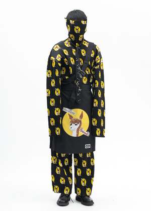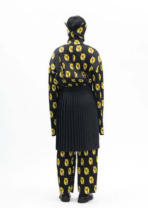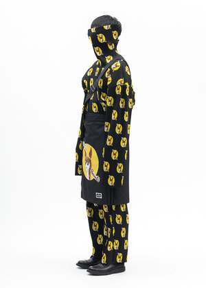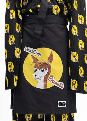 Kilt skirt in black from KIDILL x Jamie Reid. Features a partially pleated construction with multicoloured collaborative graphics across the front face. Single shoulder strap at the right hip. Oversized fit 65% Polyester, 35% Rayon Made in Japan Model is wearing size 46 Model is 6 (183 cm), 125 pounds (56 kg), usually wears M in tops. A size 30 in denim and 46 in trousers. Size 10 in shoes. Product styled with item 1 blue-kidill-x-ca4la-big-beret Product styled with item 2 white-kidill-x-edwin-a-mess-t-shirt Product styled with item 3 black-kidill-x-edwin-patch-slim-tapered-pants Product styled with item 4 black-debbie-leather-sole-loafer-kidill-x-hyusto