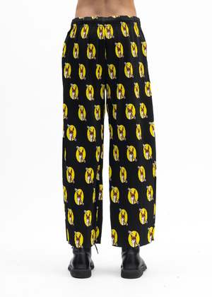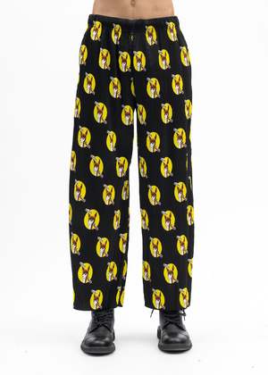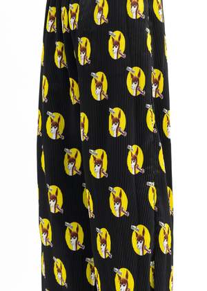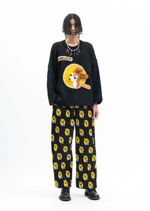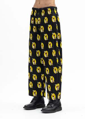 'Who Killed Bambi' pleated loose fit pants in black, from KIDILL x Jamie Reid. All-over multicoloured print. Tonal stitching throughout. Oversized fit 100% Polyester Made in Japan Model is wearing size 46 Model is 6 (183 cm), 125 pounds (56 kg), usually wears M in tops. A size 30 in denim and 46 in trousers. Size 10 in shoes. Product styled with item 1 blue-kidill-x-ca4la-big-beret Product styled with item 2 white-kidill-x-edwin-a-mess-t-shirt Product styled with item 3 black-kidill-x-edwin-patch-slim-tapered-pants Product styled with item 4 black-debbie-leather-sole-loafer-kidill-x-hyusto