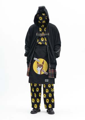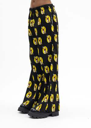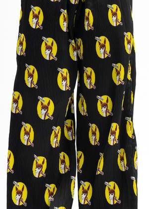 'Who Killed Bambi' pleated loose fit pants in black, from KIDILL x Jamie Reid. All-over multicoloured print. Tonal stitching throughout. Oversized fit 100% Polyester Made in Japan Model is wearing size 46 Model is 5'7" (172 cm), 98 pounds (44kg), usually wears S in tops. A size 25in denim and S in trousers. Size 8 in shoes.