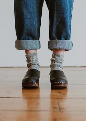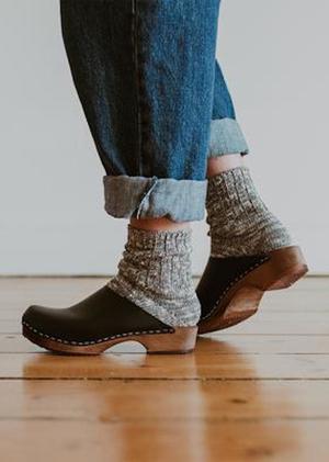 - Kitty Clogs - Klassisk Clog in Onyx - "KLASSISK Swedish [adj] classic - The original and best, Kitty Clogs classic-style Swedish clog is made in the same way it has been for hundreds of years. This traditional style is still a best-seller today and a firm Kitty favourite. Versatile and easy to wear, the comfortable Low Klassisk looks great worn with or without socks all year round. The best-selling Onyx leather is a classic black that wears beautifully over time. This is a wardrobe staple. - Kitty Clogs Low Klassisk clog has stapled leather uppers with a rounded toe and open back. The dark Alder wood base has a low 30mm heel. All of the wooden bases are ergonomically shaped inside and out for comfort and have a rubber grip on the sole. With time and wear both the leather and wooden base will soften and begin to mould to the shape of your foot. - Handmade in Sweden - FIT - The fit of this style is true to size in length and ideal for regular - slightly wider foot widths. - The fit and feel of each clog style varies. If you have a wider or narrower foot it may be that certain styles are better suited to you. Please bear this in mind and refer to the measurements and information in the carefully before ordering. - LOW HEEL BASE 30mm / fit is generally true to size - WEARING IN YOUR CLOGS - Remember that the leather, suede or nubuck uppers of your clogs may take a little time to break in, as with most new shoes. With time and wear the leather will soften and mold to your foot. Unlike with other shoes, a wooden clog base does not bend as you walk and so your heel will lift as you walk. With time and wear the wood will also soften and mould to your foot. - Your foot should fill the full length of the clog. If the width of your foot is slightly wider than that of the size that matches your length then you can go up a size. Measure your feet across the widest part of the ball of your foot and from toe to heel then compare to the measurements of the wooden bases in the chart (in the photos). - We recommend measuring your feet whilst standing to get the most accurate measurement as your feet change shape when you put weight on them. Drawing around your foot or standing on a ruler is a good trick!