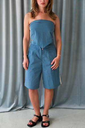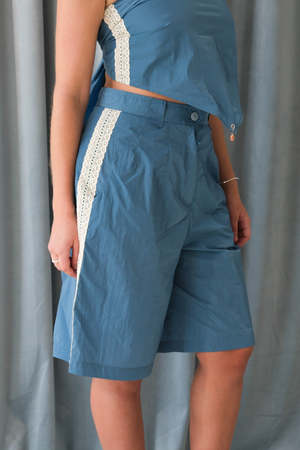 KkCo mid-rise Scoria long track short in lake blue. Crochet tape at side seam, pockets, darts at waist. Pair with the matching handkerchief for a full set. Japanese recycled Nylon Taffeta fabric with vintage wash. Fits true to size. Size up for a lower rise and baggier fit. Pam is 5'3" and wears a size S. KKCO397