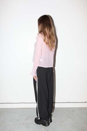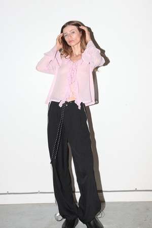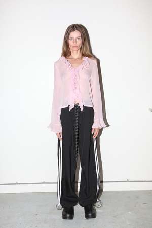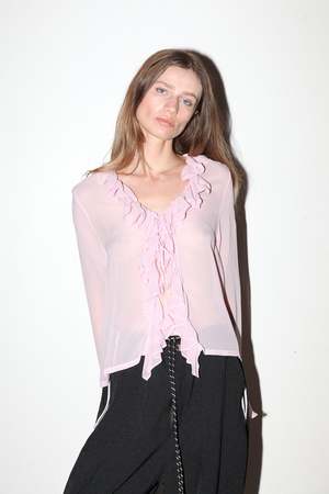 100% Silk Self ruffle along full neckline and center front Self spaghetti tie at front Flounce cuff Model is 5'6" and wears size Small. Relaxed fit. Fits true to size.