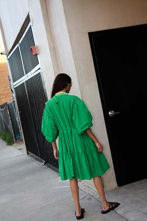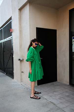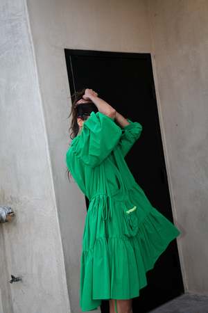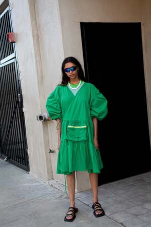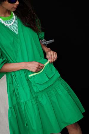 - Made in Los Angeles - Nylon taslan - Wrap dress - Tiered gathered skirt - Utility pouch pocket - Puff sleeve - Elasticated cuff - Oversized fit Size & Fit - Model is 5'9" and wears size small - Oversized fit